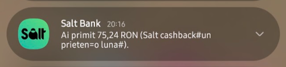Nu am mai folosit niciodată până acum vreun card cu cashback și trebuie să recunosc că îmi place. Aseară am primit următoarea notificare: