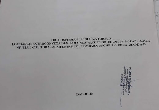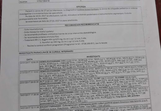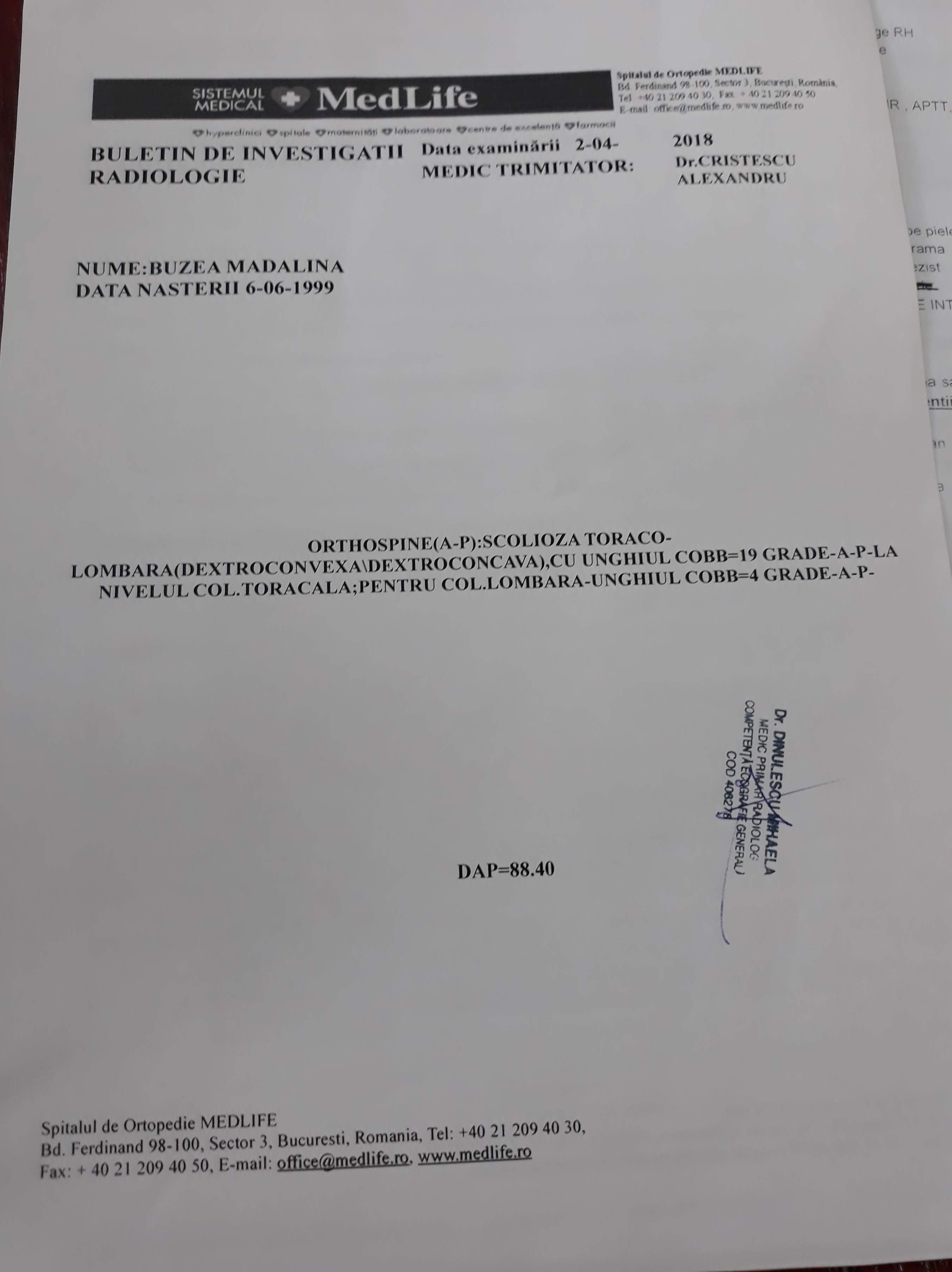 Bună ziua! Multumesc pentru raspuns. Eleva in varsta de 19 ani, Madalina sufera de Scolioza Toraco – Lombara. Boala este cumplita, iar starea Madalinei se agraveaza treptat. Drama Mădălinei a început în clasa a 9-a. Atunci a început să aibă dureri de spate. Părinții au dus-o la un consult de specialitate la Buzău, dar doctorii le-au spus că nu au motive de îngrijorare si ca sursa durerilor ar fi o poziție incomodă in banca . Însă, cu timpul, durerile fetei s-au accentuat si abia atunci s-a aflat că viata ei se află în pericol. În 2017 părinții au dus-o la spitalul „grigore alexandrescu” din capitală pentru o operație care s-a dovedit a fi un succes . Totusi, aceasta nu a facut altceva decat sa ii prelungească viata . Acum este clasa a 12-a. Anul acesta starea ei de sănătate s-a înrăutățit. Madalina mai are nevoie de inca o operatie, aceasta fiind singura ei cale de supravietuire. Operatia este foarte costisitoare: 20.000 €. Parintii fetei nu au banii necesari pentru aceasta interventie. Numarul de cont cu care ii putem salva viata Madalinei este: RON: RO61BRDE100SV50337471000 – Cont deschis pe numele fetei BUZEA MADALINA ANGELICA Acestea sunt actele doveditoare:
